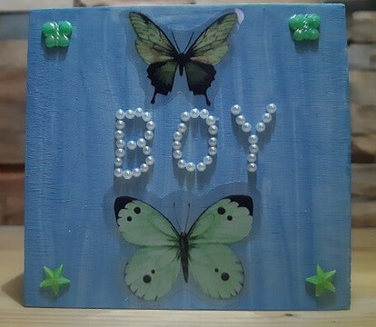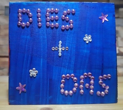 handbemalt mit Acrylfarben, mit Stickern und Glitzersteinen