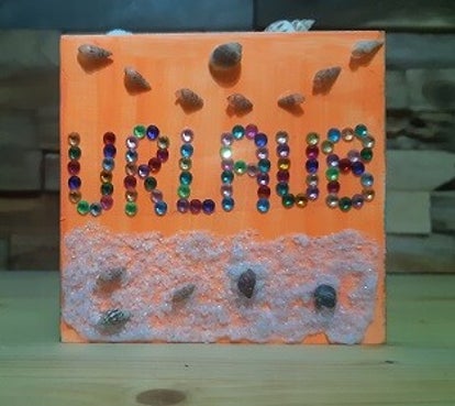 handbemalt mit Acrylfarben, mit Dekosand, Muscheln und Glitzersteinen