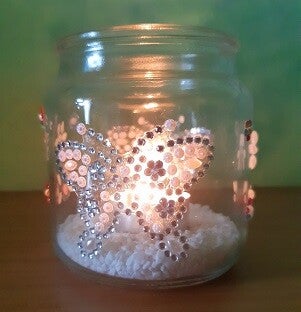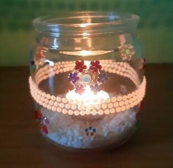 Teelichthalter aus recycelten Glas mit Glitzersteinen und Dekosand