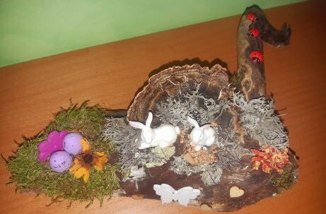 Holz eines alten Birnbaumes (hat Ecken und Kanten) mit Naturmaterialien, Osterhasen, Schmetterlingen, Blumen (selbst getrocknet) um.