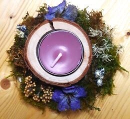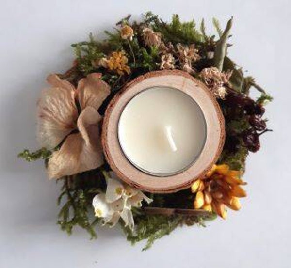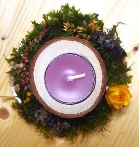 Teelichthalter aus Holz auf runder Holzscheibe mit verschiedenen Naturmaterialien (Moos, getrocknete Blumen, Beeren, Blättern usw.), getrockneten Blumen (Laura Handmade & Deko (SHD) und eigenen getrockneten Blumen).