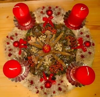 Gold- oder Silberteller mit Strohkranz, farbigen Kerzen, Dekoelementen (Strohsterne, Glaskugeln, kleine Klöckchen u.m.) und verschiedenen Naturmaterialien (Orangen, Beeren, Schilff usw.)