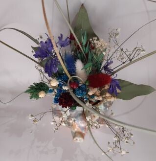 Diese Dekoteil aus Raysin (Rayher 100/200) ist in verschiedenen Farben (heyamijiao/TimesRui) und getrockneten Blumen (von Laura Handmade & Deko (SHD) oder eigenen getrockneten) erhältlich und sehr dekorativ. Die Trockenblumen sind in einer kleinen Glasflasche/Tontopf mit Dekosand plaziert.