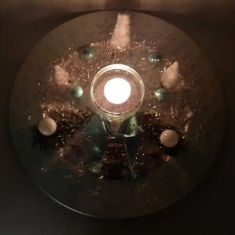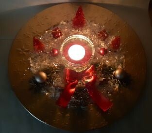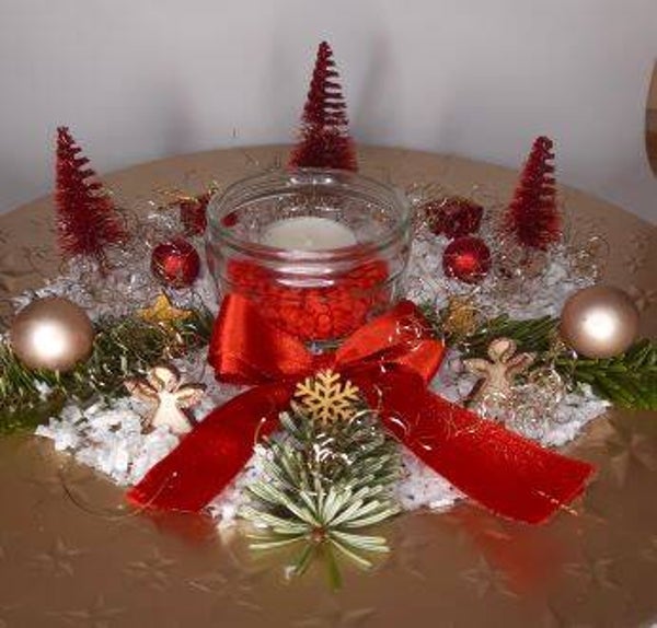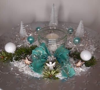 Teller in Gold- oder Silberoptik (Kunststoff), Dekoschnee (Maisstärke), Bäume (Flaschenbürste), Glaskugeln, echten Tannenzweigen, recycelten Glas mit Dekosteinen, Holzdeko (Engel, Stern, Schneeflocke), Schleife, Engelshaar gold/silber.